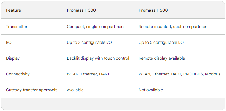 The Promass F 300 is a good choice for applications that do not require custody transfer approvals or the use of the additional I/O options. The Promass F 500 is a better choice for applications that require these features.